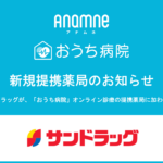 お知らせプレスリリース アナムネ、サンドラッグと提携開始 「おうち病院」オンライン診療の提携薬局が全国で8200店以上に 株式会社アナムネ(本社:東京都中央区、代表取締役CEO:菅原 康之、以下「アナムネ」)は、2026年4月1日より、「おうち病院」オンライン診療の提携薬局として、サンドラッグとの提携を開始いたします。 「おうち病院」と ... 2026/04/01