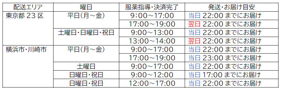 A. エリア、曜日によって異なりますので、下記の表をご参考にしてください。東京23区・横浜市・川崎市は、平日18:00、土日祝13:00までにオンライン服薬指導が完了していれば当日22:00までに指定住所にお届けします。
