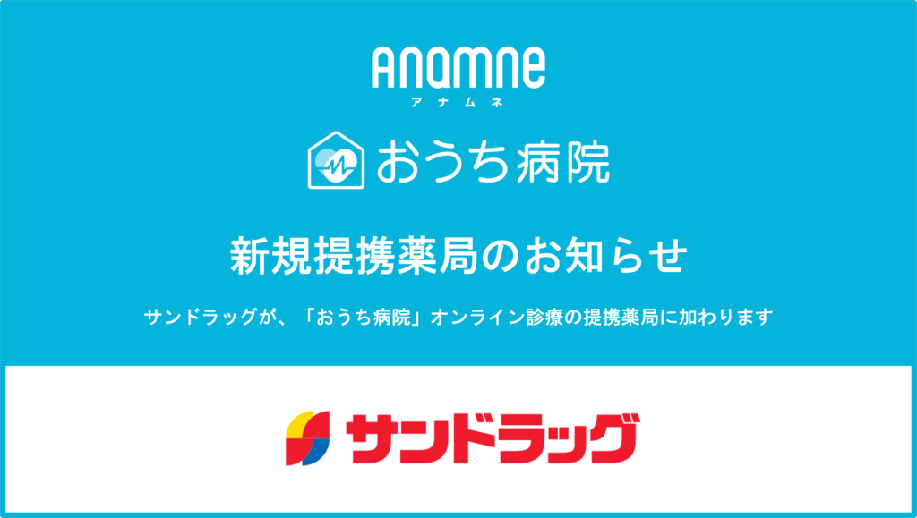 株式会社アナムネ(本社:東京都中央区、代表取締役CEO:菅原 康之、以下「アナムネ」)は、2026年4月1日より、「おうち病院」オンライン診療の提携薬局として、サンドラッグとの提携を開始いたします。